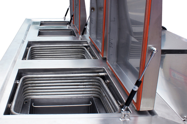 四槽冷凝防爆超聲波清洗機(jī)可使用如三氯乙烯、三氯乙烷等或其他性質(zhì)相似的清洗劑等作為清洗介質(zhì)。