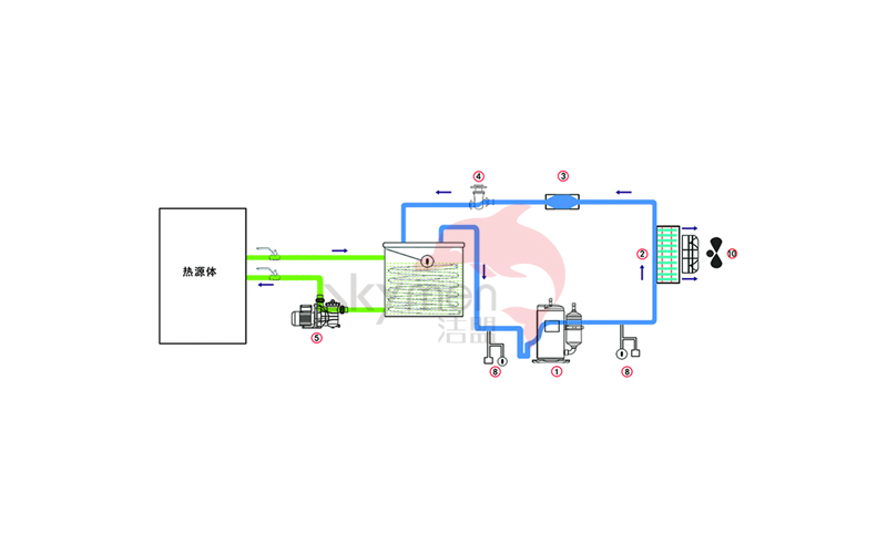 組成:機(jī)架+壓縮機(jī)+冷凝器+蒸發(fā)器+水泵+風(fēng)機(jī)+冷媒。
