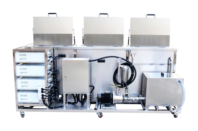 利用超聲波在液體中產(chǎn)生的“空化效應(yīng)”,使污垢從產(chǎn)品表面剝離脫落。循環(huán)過濾系統(tǒng)能夠?qū)⑵≡谇逑匆荷蠈与s質(zhì)及油污進(jìn)行過濾,達(dá)到循環(huán)使用清洗液的目的,節(jié)省清洗成本。